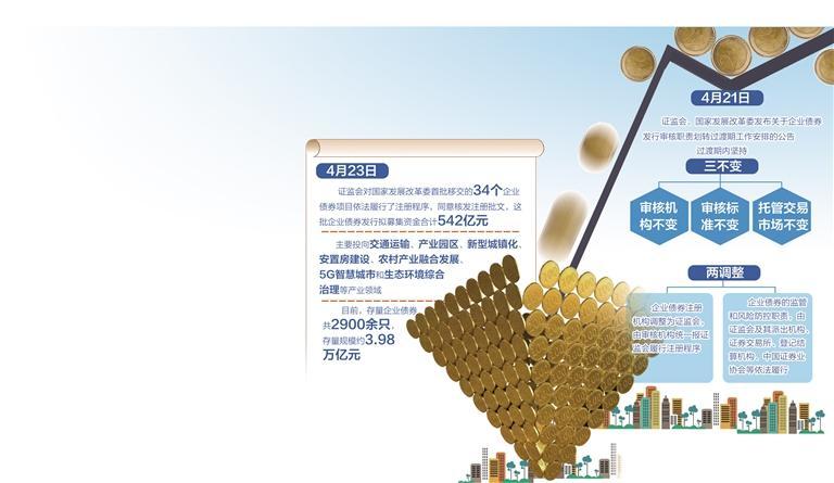 根据证监会披露,4月23日,首批国家发展改革委移交的34个企业债券项目,证监会已依法履行注册程序,同意核发注册批文。这批企业债券发行拟募集资金合计542亿元,主要投向交通运输、产业园区、新型城镇化、安置房建设、农村产业融合发展、5G智慧城市和生态环境综合治理等产业领域。