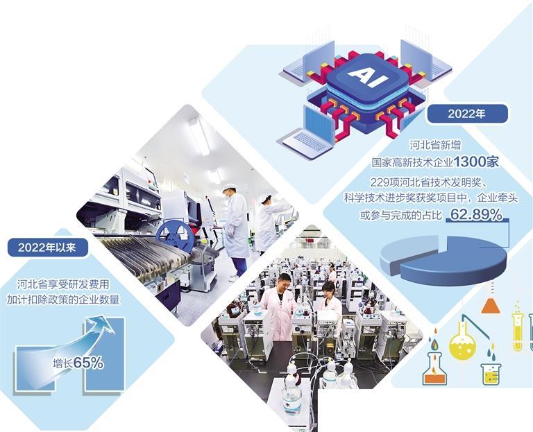 2022年,河北新增国家高新技术企业1300家,国家科技型中小企业数量达到9600多家,增幅超150%、居全国第二;229项河北省技术发明奖、科学技术进步奖获奖项目中,企业牵头或参与完成的占比62.89%,创新创造的活力在河北涌流。