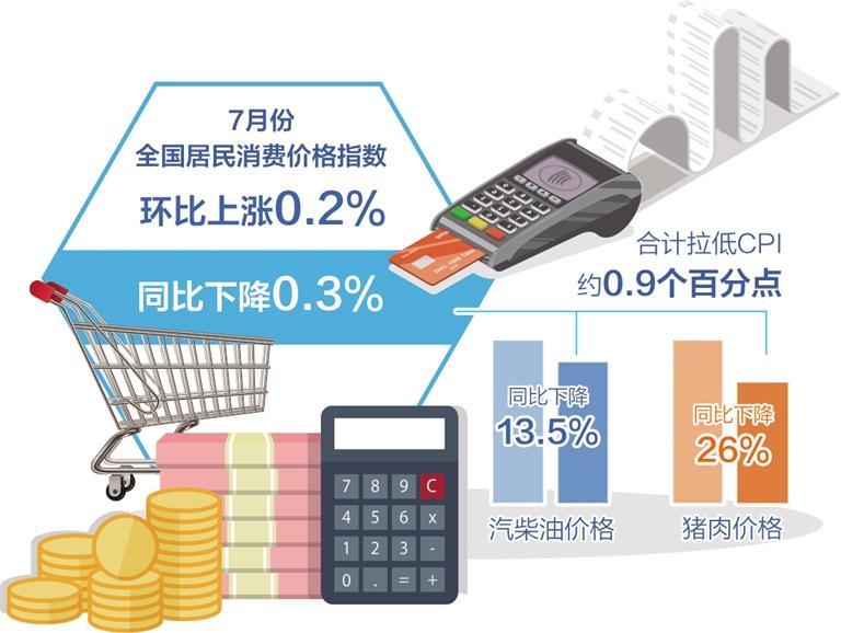 国家统计局数据显示,今年7月份全国居民消费价格指数(CPI)环比上涨0.2%,由降转涨;同比由上月持平转为下降0.3%。工业生产者出厂价格指数(PPI)环比、同比降幅均收窄。