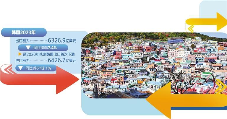 日前,韩国产业通商资源部发布了《2023年12月及年度进出口动向》,初步统计韩国2023年出口额为6326.9亿美元,同比降幅7.4%,这是2020年以来韩国出口首次出现下滑,韩国政府将原因归结为西方经济体的大幅加息和全球经济复苏迟缓。2023年韩国进口额则为6426.7亿美元,比2022年减少了12.1%。