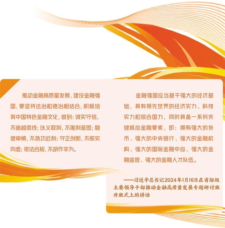 习近平总书记在省部级主要领导干部推动金融高质量发展专题研讨班开班式上指出:“推动金融高质量发展、建设金融强国,要坚持法治和德治相结合,积极培育中国特色金融文化,做到:诚实守信,不逾越底线;以义取利,不唯利是图;稳健审慎,不急功近利;守正创新,不脱实向虚;依法合规,不胡作非为。”这为新时代新征程推动金融高质量发展、培育中国特色金融文化提供了根本遵循和行动指南,是习近平经济思想的重要组成部分。