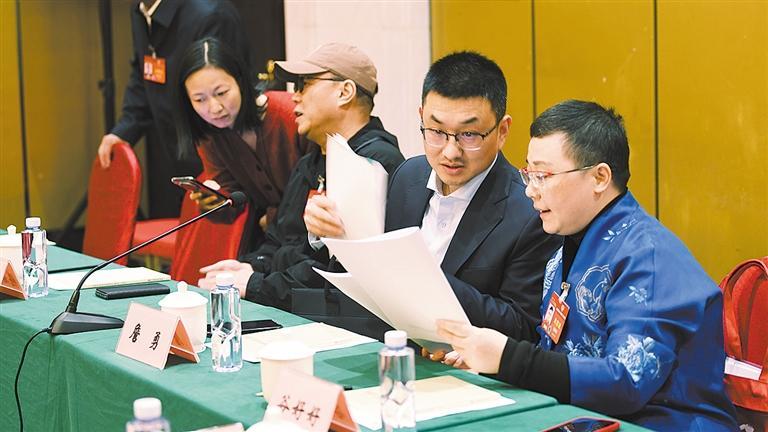 3月5日下午,出席全国政协十四届二次会议的文化艺术界委员分组审议政协常委会工作报告。全国政协委员谷好好(右一)、詹勇(右二)就报告相关内容进行讨论。本报记者 李景录摄