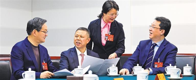 3月9日,十四届全国人大二次会议江苏代表团举行小组会议,审议国务院组织法修订草案修改稿、最高人民法院工作报告、最高人民检察院工作报告。会后,全国人大代表昝圣达、高纪凡、刘静瑜、石磊(从左至右)就发展新质生产力话题继续讨论。本报记者 高兴贵摄