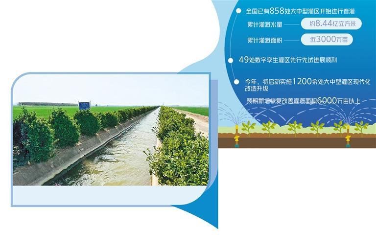随着气温回升,春耕备耕正有序推进,全国大中型灌区也陆续开闸春灌。根据水利部最新调度,全国已有858处大中型灌区开始进行春灌,累计灌溉水量约8.44亿立方米,累计灌溉面积近3000万亩。