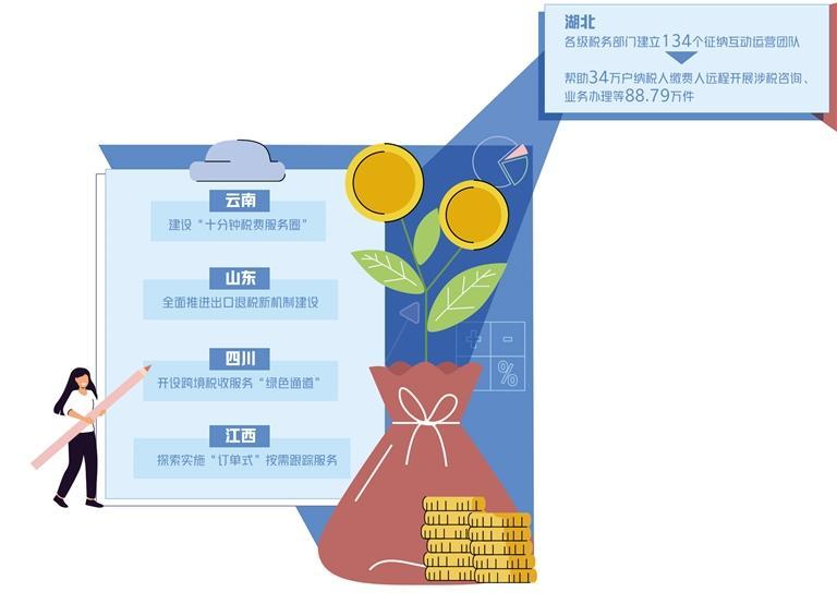 建立“十分钟税费服务圈”、实现更多高频业务“一次不用跑”、拓展“政策找人”、创新“税路通”服务……今年以来,各地税务部门聚焦纳税人缴费人需求、借力数字化信息化手段持续上新税费服务,着力为企业添便利减成本,推动税费优惠直达快享,进一步优化税收营商环境。