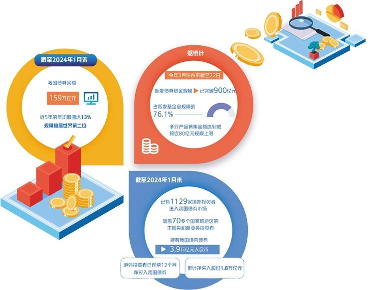 截至2024年1月末,已有1129家境外投资者进入我国债券市场,涵盖70多个国家和地区的主权类和商业类投资者,持有我国境内债券3.9万亿元人民币,境外投资者已连续12个月净买入我国债券,累计净买入超过1.8万亿元。