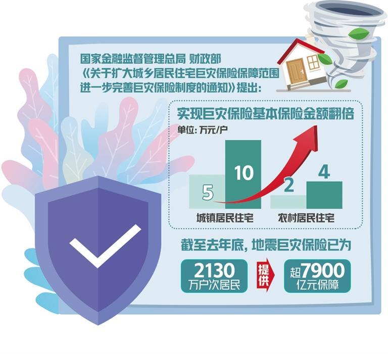 本报北京3月30日讯(记者于泳)国家金融监督管理总局、财政部日前印发《关于扩大城乡居民住宅巨灾保险保障范围进一步完善巨灾保险制度的通知》。