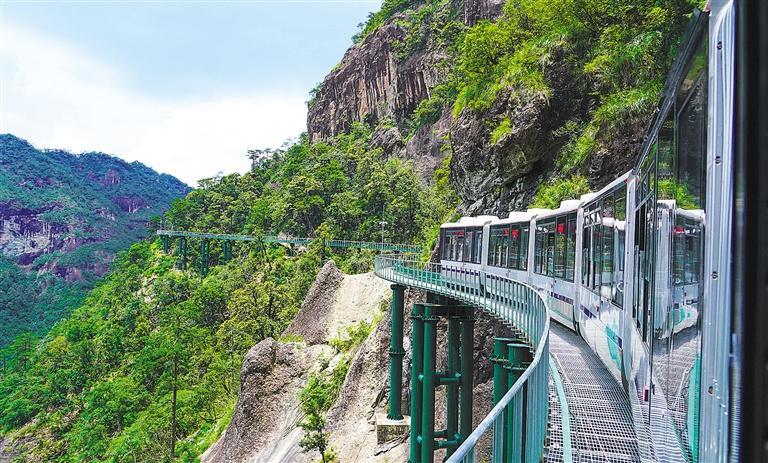 7月11日,“悬崖动车”行驶在江西省抚州市大觉山景区。当日,30列高山悬崖跨座式单轨游览车及轨道系统,在大觉山景区完成交付。大觉山“悬崖动车”项目全线路均“嵌”于半山腰上,其中三分之一以上线路在悬崖峭壁旁,可让游客置身海拔850米到1150米高空。新华社记者 郭杰文摄