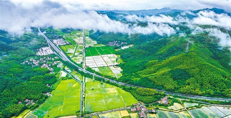 7月13日,安徽省芜湖市繁昌区峨山镇东岛村,宁芜高速公路和村庄、乡道、田野、青山等相映成景。近年来,当地持续加大交通基础设施建设,不断完善交通网络布局,促进了区域经济协调发展。肖本祥摄(中经视觉)
