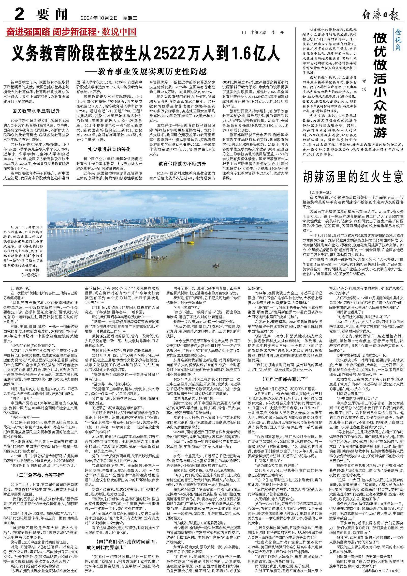 义务教育普及程度大幅提高。1949年,我国小学学龄儿童净入学率仅为20%;近年来,小学学龄儿童净入学率接近100%。1949年,全国义务教育阶段在校生2522万人,2023年,全国共有义务教育阶段在校生1.6亿人。