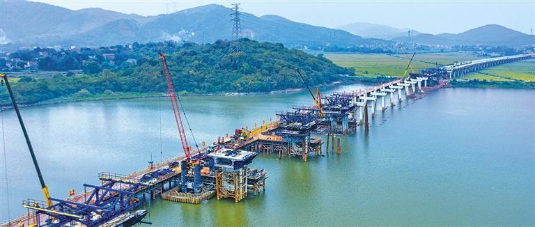 10月13日,安徽省铜陵市枞阳县天天高速跨罗昌河特大桥项目现场,建设者紧盯项目节点进度,确保施工有序推进。该高速对加强安徽与长三角其他地区联系、促进区域经济快速发展具有重要意义。
