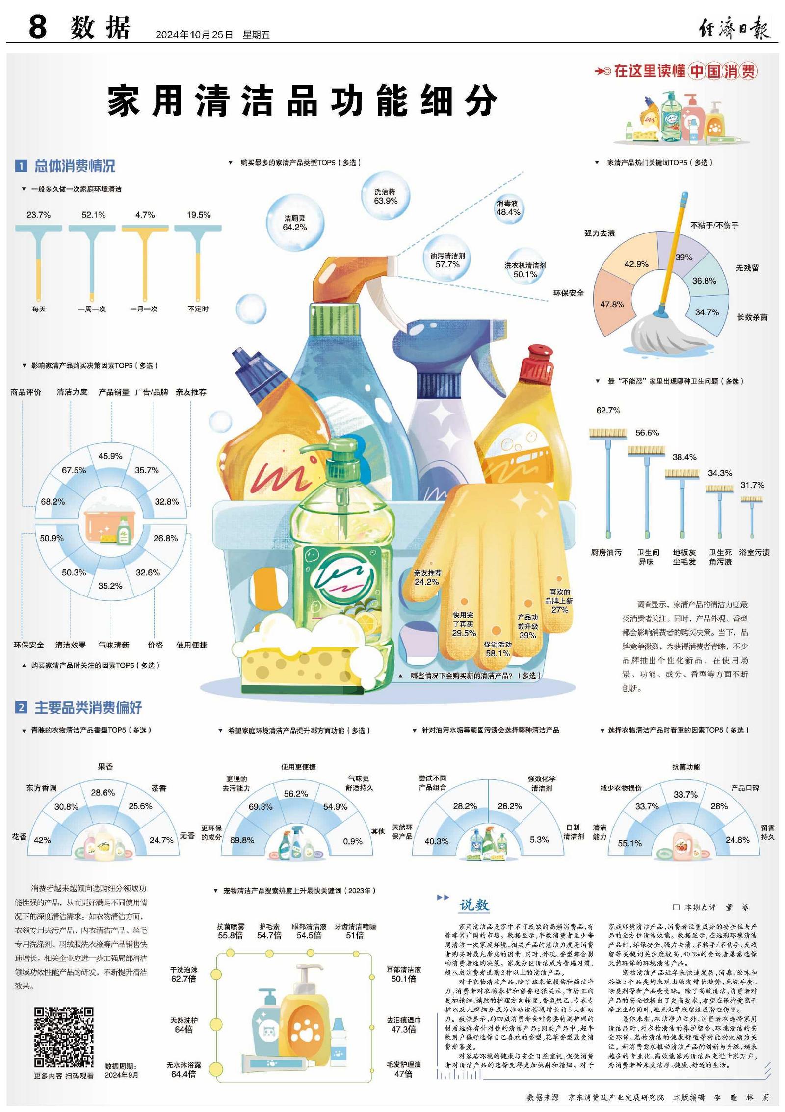 总体来看,在洁净力之外,消费者在选择家用清洁品时,对衣物清洁的养护留香、环境清洁的安全环保、宠物清洁的健康舒适等功能功效颇为关注。新消费需求推动清洁产品的创新与升级,越来越多的专业化、高效能家用清洁品走进千家万户,为消费者带来更洁净、健康、舒适的生活。