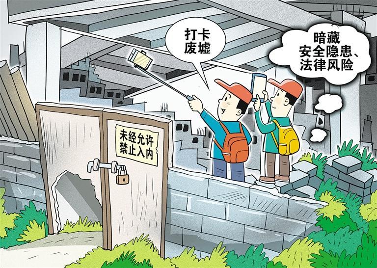 光线昏暗、场景阴森、草木间小鸟突然飞起……近来,网络上掀起一股废墟打卡风。为了流量,一些网络博主进入废弃建筑拍照、拍摄短视频并在平台上分享,因场景特殊的荒凉感、工业感,引来众多网友关注。然而,由于年久失修、缺乏保护措施,很多废墟“网红点”暗藏隐患,近年来打卡废墟受伤事件时有发生。同时,一些博主为了博眼球,刻意在视频中制造迷信、恐怖气氛,有违《网络主播行为规范》中的相关规定。对此,一方面,应形成合力,刹住没有安全保障的“废墟探险”风;平台要在资质审核、内容审核、违规信息处置等环节加强把关。另一方面,可因地制宜加强对废弃场所的改造利用,让这类场所充分发挥余热,成为新的城市景观、文旅场所。(时 锋)