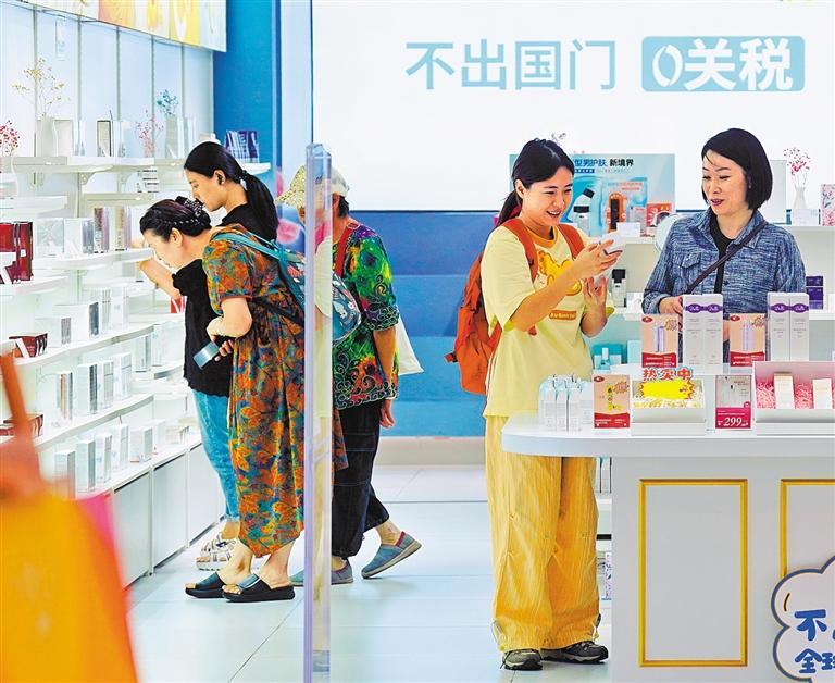 ②9月25日,游客在位于解放碑步行街的陆海新通道国际消费中心选购商品。这是西部首个核心商圈保税展示交易中心。
