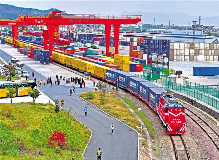 11月18日,一趟满载110个标准箱出口货物的中欧班列从义乌西站驶出,驶往逾1.3万公里外的西班牙马德里,义乌中欧班列迎来开行十周年节点。据义乌海关统计,10年来,义乌中欧班列累计开行突破6700列,发运货物超67万标准箱。吕 斌摄(中经视觉)