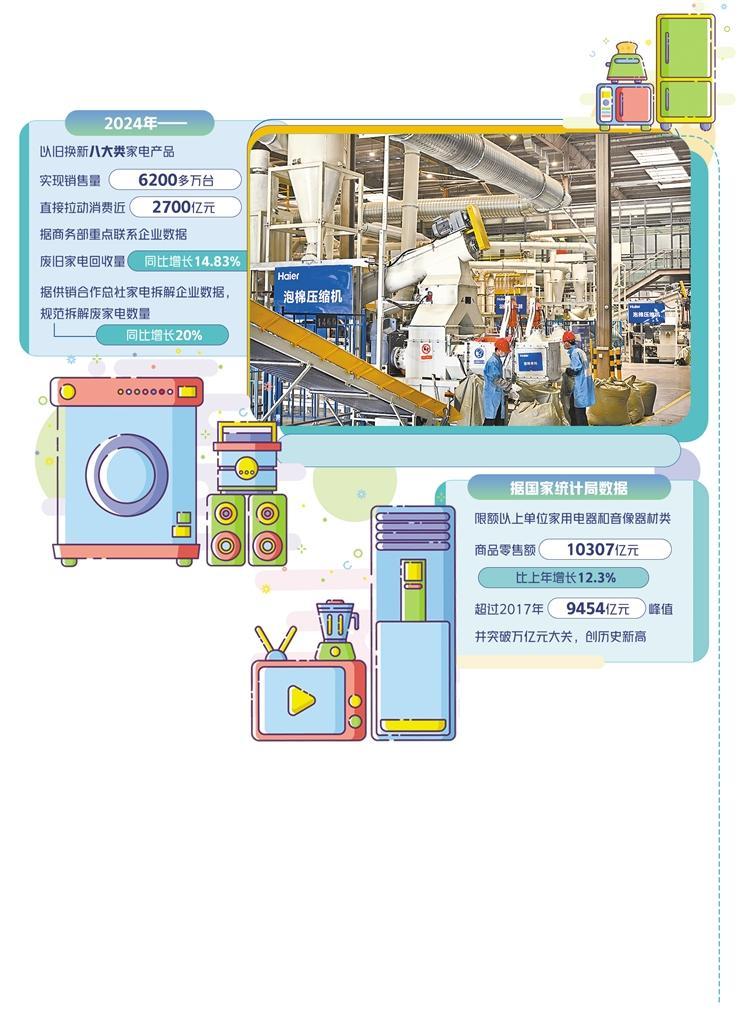 自《推动大规模设备更新和消费品以旧换新行动方案》(以下简称《行动方案》)实施以来,家电市场消费潜力得到显著释放。数据显示,2024年,中央加力支持以旧换新八大类家电产品实现销售量6200多万台,直接拉动消费近2700亿元。日前,国家发展改革委副主任赵辰昕在国务院政策例行吹风会上介绍,2025年将延续并加力扩围实施“两新”政策,享受以旧换新补贴的家电产品种类由2024年的8类增至12类,单件最高补贴可达销售价格的20%。