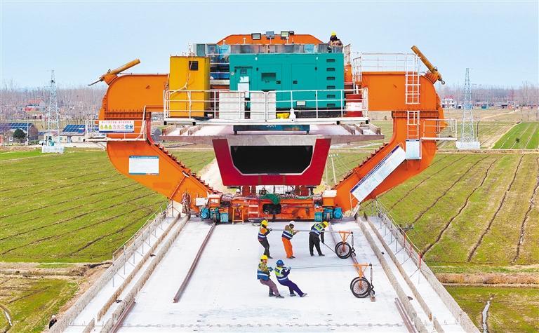 ▼2月17日,江苏省淮安市宁淮城际铁路(洪泽段)项目现场,工人在架设高铁箱梁。