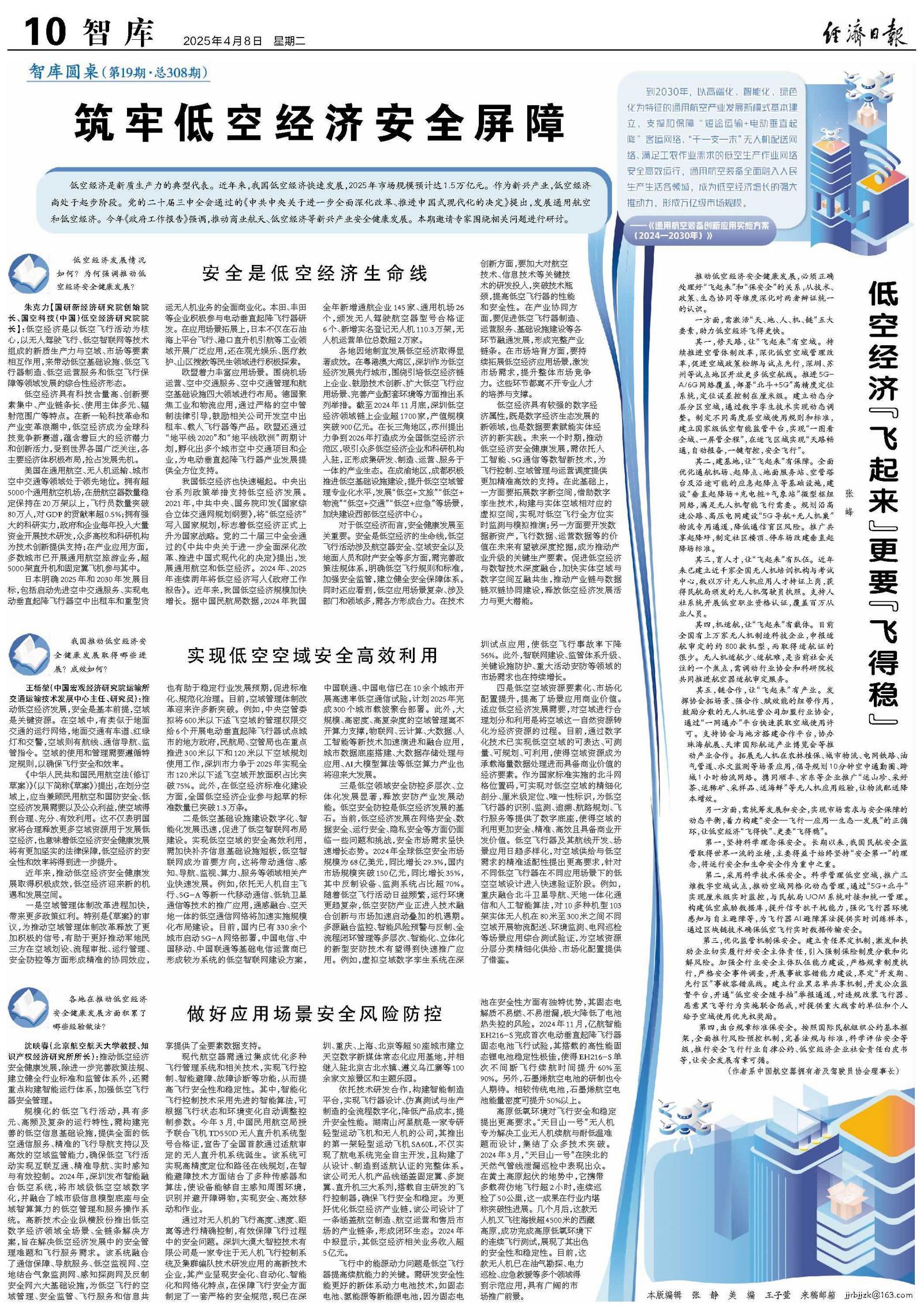 沈映春(北京航空航天大学教授、知识产权经济研究所所长):推动低空经济安全健康发展,除进一步完善政策法规、建立健全行业标准和监管体系外,还需重点构建智能运行体系,加强低空飞行器安全管理。