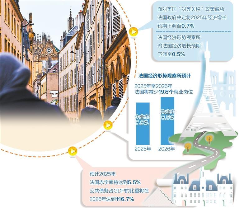 有法国经济学家认为,美国关税政策使持续脆弱的法国经济复苏之路变得更加崎岖。法国央行曾在3月份将法国经济增长预期下调至0.7%,法国经济形势观察所也于近日将增长预期下调至0.5%,并预计2025年至2026年,法国将减少19万个就业岗位,失业率将在2025年底攀升至7.9%,在2026年底达8.5%。同时,法国经济形势观察所预计,2025年法国赤字率将达到5.5%,公共债务占国内生产总值(GDP)比重将在2026年达到116.7%。这一系列预测数据充分显示出,在国内政治不稳、外部贸易冲突隐忧频现背景下,部分机构对法国经济未来复苏前景持悲观态度。对此,法国政府正采取双重策略,一方面积极寻求外交谈判空间,另一方面强化欧洲内部市场的防御与韧性,希望以此稳住市场及投资者信心。为稳定投资环境,法国政府已召集多家企业高管,鼓励其加大对欧洲的投资力度,强调“这是他们的理性之选,因为欧洲是一个稳定、民主、可预见的经济区域”,同时,表示支持与南美共同市场达成贸易协议。