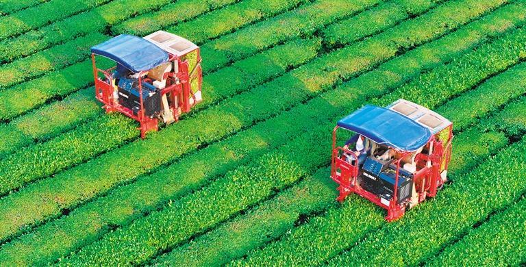 ◀4月28日,江西吉安市泰和县生态茶叶种植基地,农技员驾驶智能采茶机采收春茶。