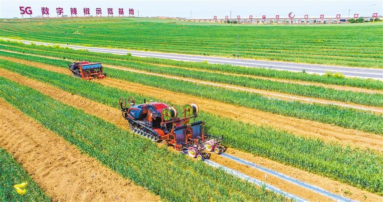 ▶4月25日,河南洛阳市新安县铁门镇千唐红5G数字辣椒示范基地,无人驾驶辣椒直播机在田中作业。