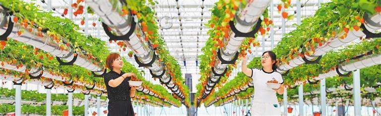 ▲4月16日,山东东营市广饶县广饶街道“莓”好颜徐草莓采摘基地。通过无土栽培、立体种植和物联网技术种植的“空中草莓”,吸引游客前来采摘。