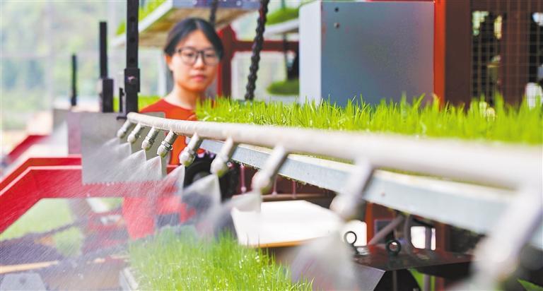 ▼4月28日,四川广元市剑阁县汉阳镇壮岭村福心育苗研发中心,农技人员操作智能喷淋设备浇灌秧苗。