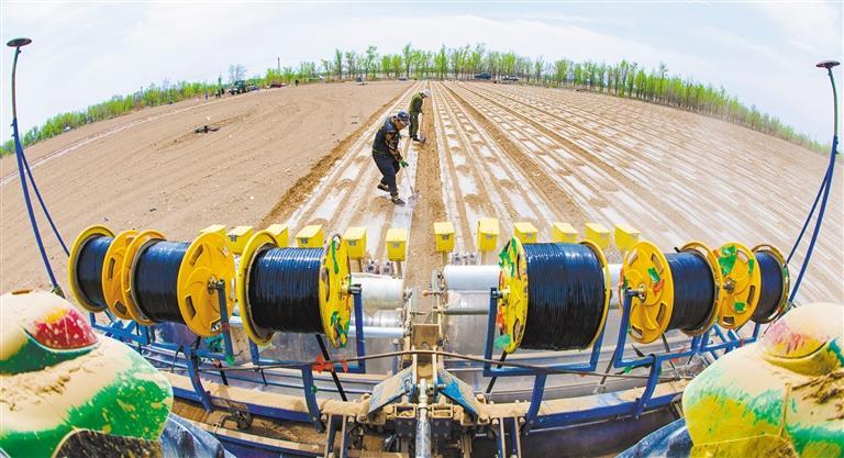 ▼4月18日,新疆昌吉国家农业高新技术产业示范区智慧农场,农户在用北斗卫星导航无人驾驶拖拉机播种棉花。