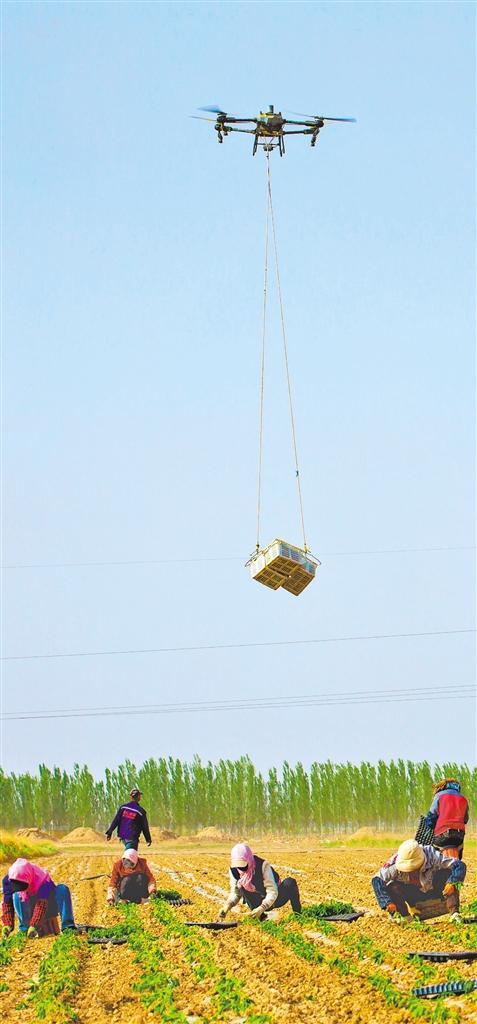 ▶5月5日,甘肃张掖市老寺庙农场辣椒种植基地,菜农使用无人机运送辣椒苗。