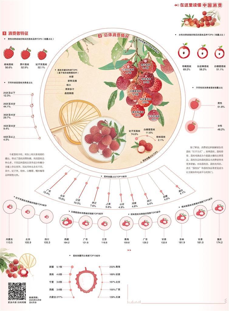 荔枝消费正在向多元化发展。虽然妃子笑荔枝以74.6%的销量占比位列第一名,但黑叶、三月红、白糖罂、桂味等口味的荔枝同比增速均超过3倍,消费者对肉厚、新鲜采摘、核小、清甜多汁的核心需求未变,对风味的差异化需求日益显著。目前,我国有200多个荔枝品种,极大丰富了消费者的选择。