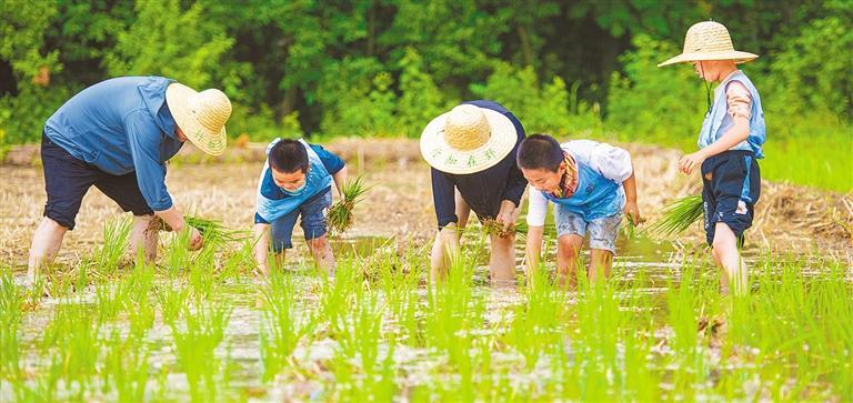◀6月14日,江苏省宿迁市宿城区蔡集镇田洼村,孩子们在父母的陪伴下体验农耕劳动。