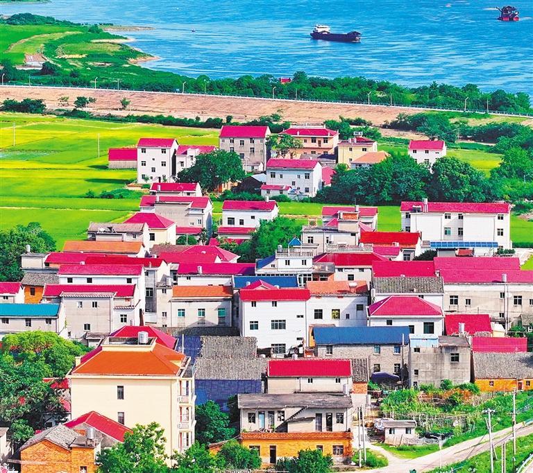 ▼6月14日,江西省丰城市小港镇南岸村,鳞次栉比的红瓦顶农房与绿色田园构成一幅和美乡村画卷。朱海鹏摄(中经视觉)