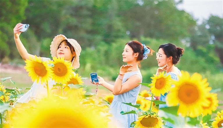 ◀6月17日,安徽省亳州市谯城区,盛开的向日葵吸引游客前来赏花游玩。