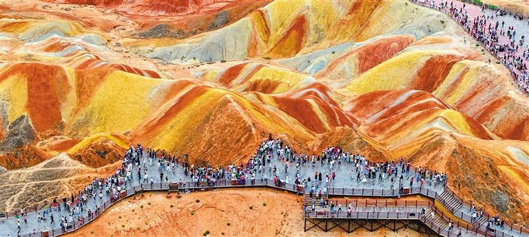 7月2日,雨后的甘肃张掖七彩丹霞景区色彩绚丽,引来众多游客。近年来,当地提升服务质量,加强数字化和智慧化景区建设,积极创建世界自然遗产景区。