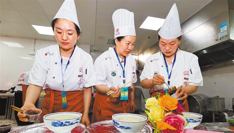 6月25日,在安徽省淮北市第十二届烹饪技能竞赛上,选手在制作淮北烫面。