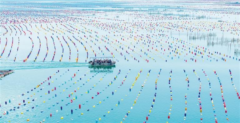 7月3日,广东汕头南澳岛海上养殖七彩蚝田里,渔民们划着小船穿梭其中,采收肥美生蚝。深浅不一的蚝排与海水相映成趣,绘就美丽的海上画卷。