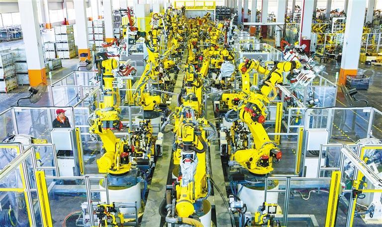 位于浙江省湖州市长兴经济技术开发区的长兴地通汽车部件有限公司,工业机器人高速运转,加紧生产新能源汽车车身冲压件及车桥产品。谭云俸摄(中经视觉)