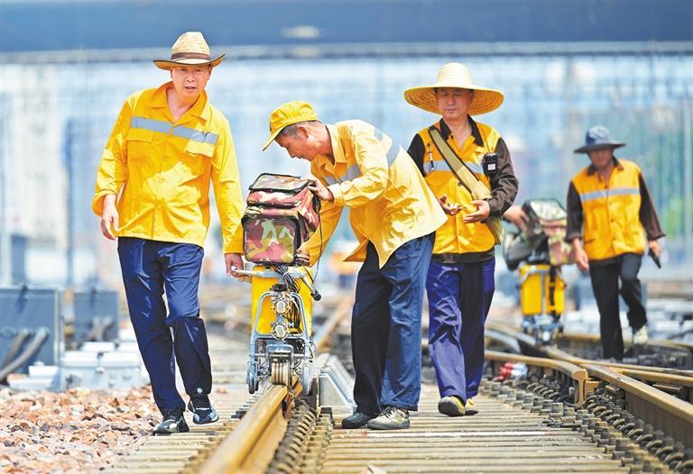 6月27日,河南省郑州市,国铁郑州局郑州桥工段,工作人员对郑州站的道岔设备进行探伤作业。