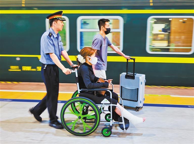 7月3日,呼和浩特东开往成都西的K195/6次列车在呼和浩特东站停靠时,包头客运段成都车队列车员王慧(左)在协助重点旅客乘车。
