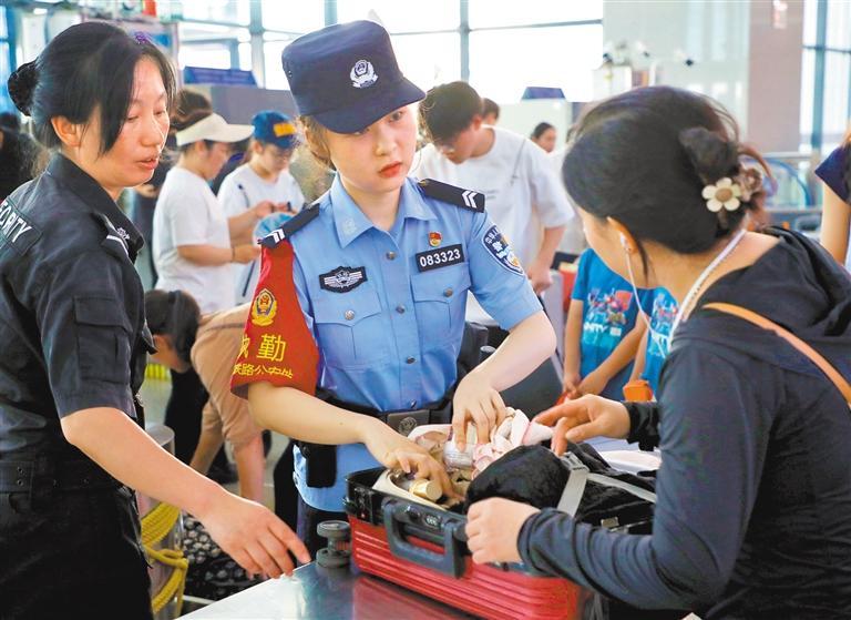 7月1日,安徽六安火车站,上海铁路公安局合肥铁路公安处六安站派出所民警对旅客携带物品进行抽查,确保暑运安全。