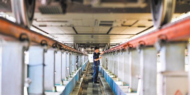 6月22日,地勤机械师在南京动车段南京南动车运用所检修库里检修动车。