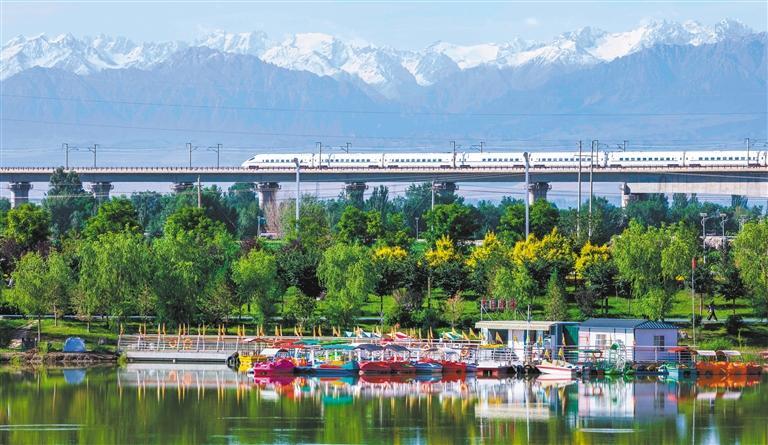 7月6日,甘肃省张掖市甘州区,一列动车组列车飞驰在兰新线。目前正值暑运客流高峰,兰新铁路部门科学优化运输组织方案,加大动车组运力投放,保障旅客出行需求。