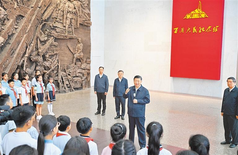 在纪念馆大厅,习近平同前来参观的青少年学生和纪念馆工作人员亲切交流。他说,88年前的今天发生的“七七事变”,是中华民族全面抗击日本侵略者的起点,前事不忘、后事之师,到这里来就是接受精神洗礼。广大青少年生逢其时,要赓续红色血脉,树立强国有我的远大志向,做堂堂正正、光荣自豪的中国人,勇担民族复兴的时代大任。