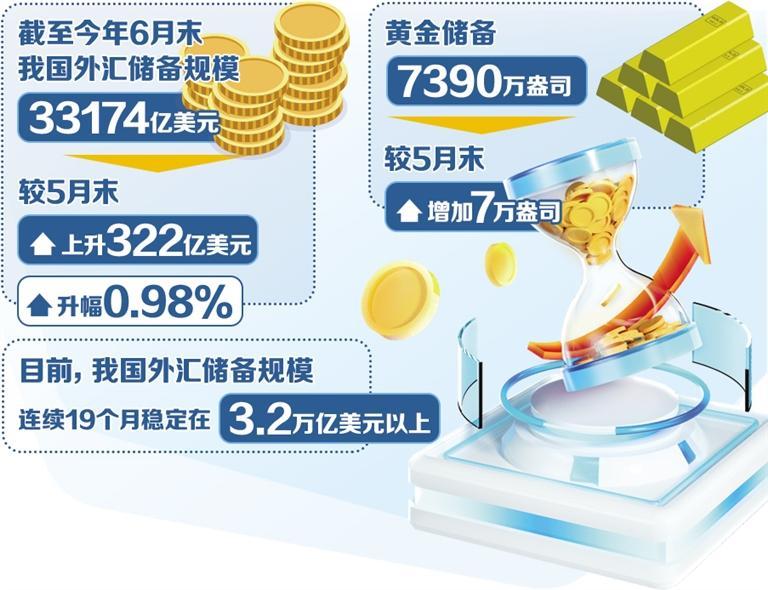 国家外汇管理局7月7日发布的统计数据显示,截至今年6月末,我国外汇储备规模为33174亿美元,较5月末上升322亿美元,升幅为0.98%。目前,我国外汇储备规模已连续19个月稳定在3.2万亿美元以上。