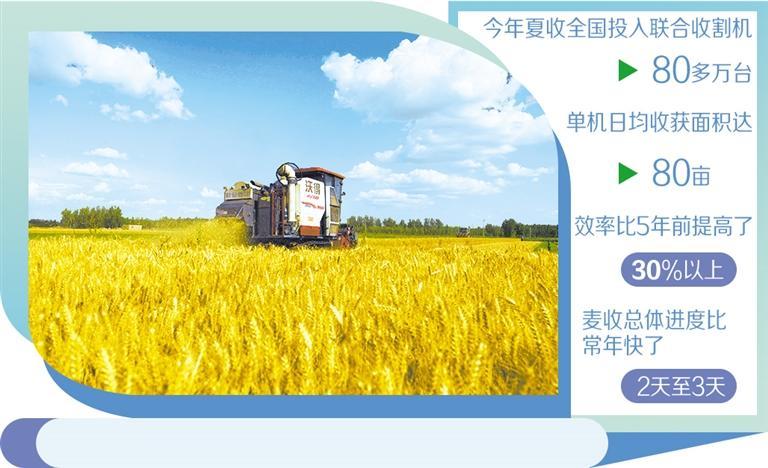 数十万台收割机追逐着小麦成熟的节奏,由南到北作业,成为“三夏”生产的一道风景。据农业农村部数据,今年夏收全国投入联合收割机80多万台,其中跨区作业的超20万台,国产9公斤/秒至10公斤/秒大喂入量联合收割机成为跨区作业主力机型;单机日均收获面积达80亩,效率比5年前提高了30%以上,麦收总体进度比常年快了2天至3天。预计今年全国小麦平均机收损失率继续控制在1%以内的较好水平,为夏粮丰收到手和全年粮食稳产提供了有力保障。