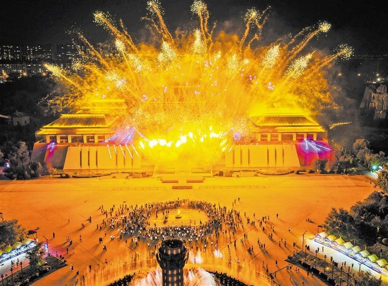 7月4日,游客在山东省东营市广饶县孙子文化园景区观看夏夜烟花表演。