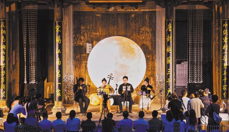 7月8日,中国音乐学院实践团在安徽省黄山市黟县宏村月沼音乐会上演出。