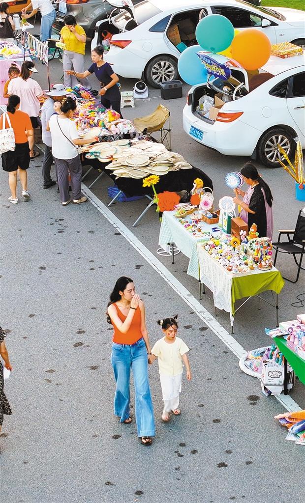 7月6日,江苏省徐州市大龙湖畔停放的私家车后备厢变身成移动商铺,吸引市民前来选购。