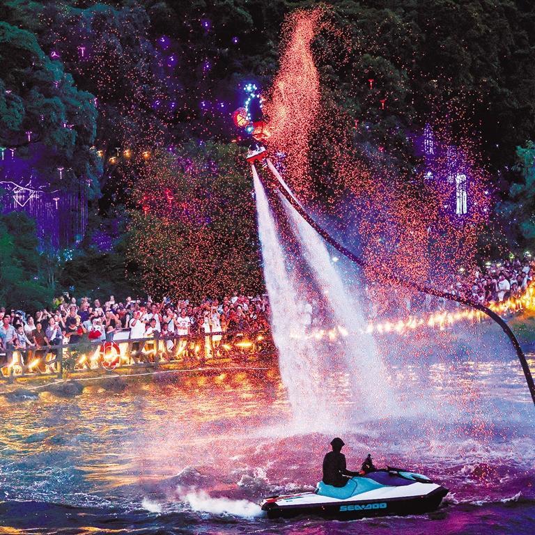 7月6日,浙江省温岭市长屿硐天景区,游客在欣赏非遗打铁花表演。近年来,当地不断拓展夜间消费新场景,释放夜经济活力。