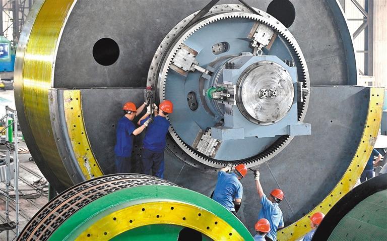 在河南省洛阳市的中实洛阳重型机械有限公司,工作人员在装配超大尺寸6米双筒可分离式提升机。